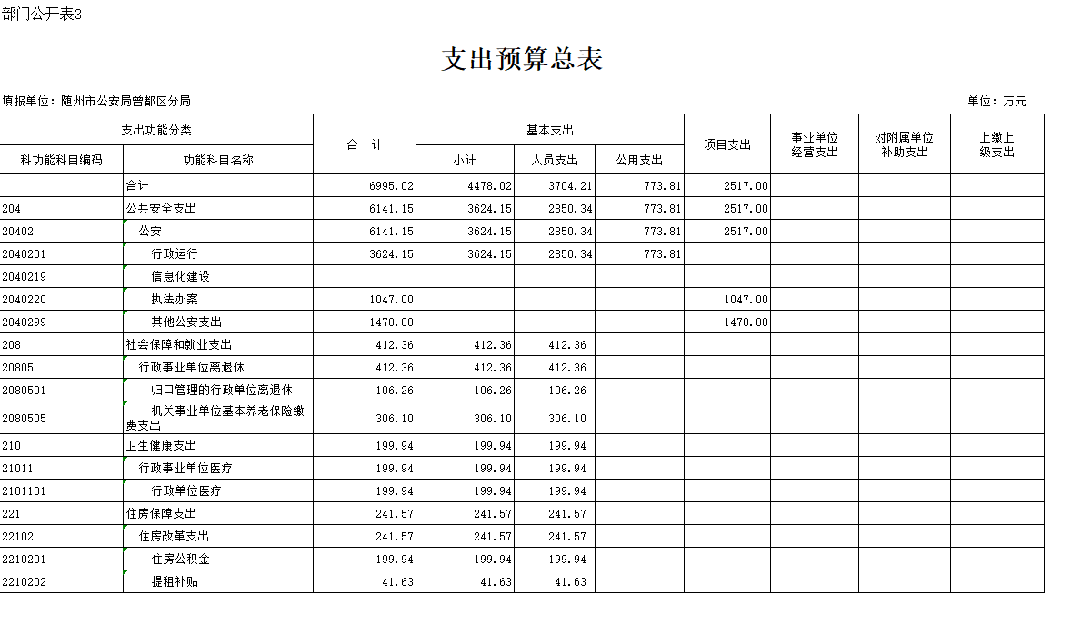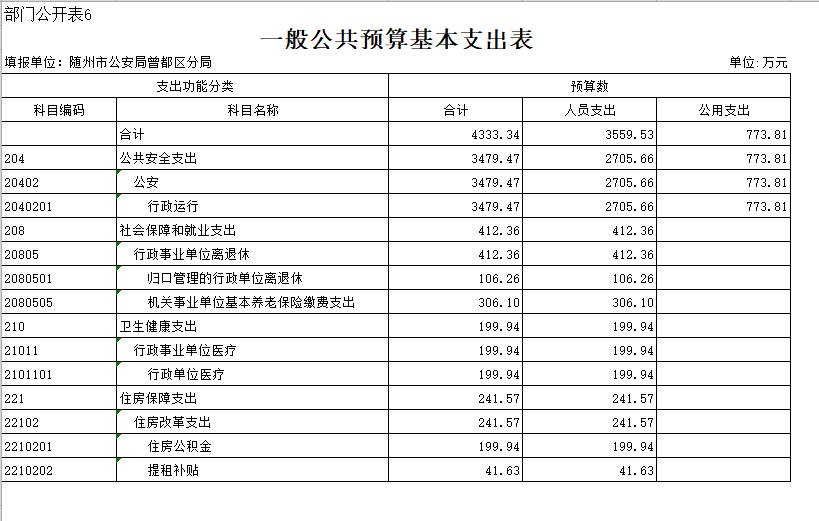 (三)按支出功能分类,公共安全支出6071.15万元,比上年减少57.53万元,减少0.94%,主要是减少人员支出和公用支出;社会和保障就业支出412.36万元,比上年增加77.31万元,增加23.07%;医疗卫生支出199.94万元,比上年增加15.65万元,增加8.49%;住房保障支出241.57万元,比上年减少10.54万元,减少4.18%。主要原因是上年预算划拨曾都分局经费按照人员比例计算,不够准确,本年按照预算工资表计算。