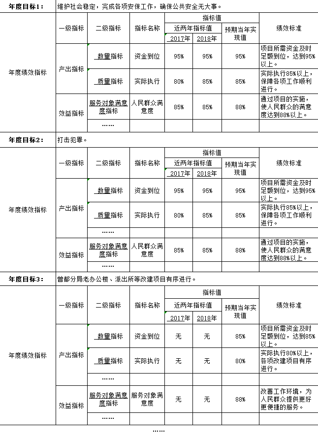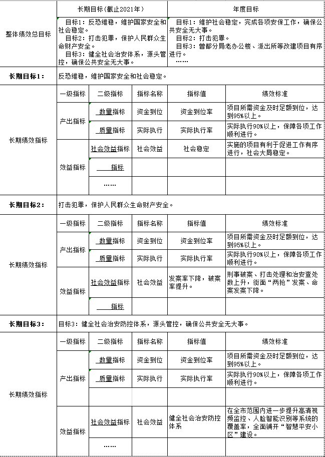社会效益指标:指项目执行绩后,产生的社会效益。主要根据市公安局开展工作履职产生的社会效益,通过发案率下降、破案率上升以及政府和上级主管单位对部门工作情况的评价来确定。