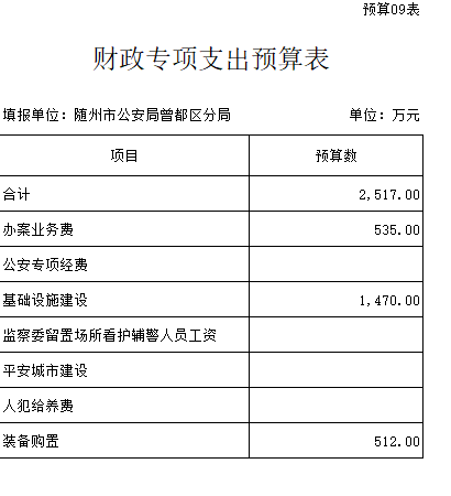 曾都分局涉案财物及业务技术用房维修(老办公楼)2019年预计支出670万元,使用结余资金550万元,其他收入120万元。