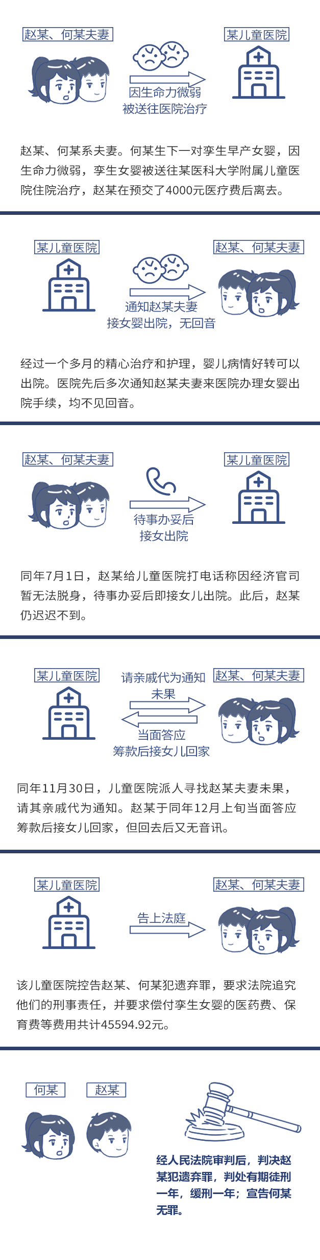 赵某、何某系夫妻。何某生下一对孪生早产女婴,住进某人民医院妇产科。根据医嘱,赵某随即乘车将孪生女婴送往某医科大学附属儿童医院住院治疗。入院时,这对女婴体重分别为1350克和1400克,生命力极其微弱。当时医生告知,女婴住院过程中可能发生呼吸暂停、黄疸、低温、败血症,预计后果有好转、恶化、死亡几种可能。赵某在预交了4000元医疗费后即离去。后来,经过医务人员一个多月的精心治疗和护理,婴儿病情好转可以出院。医院即按照赵某提供的住址,先后多次发电报、去信通知赵某夫妻来医院办理女婴出院手续,均不见回音。在此期间,何某因产后体质虚弱,又患肝炎,于同年3月17日至6月3日在人民医院治疗。同年7月1日,赵某给儿童医院打电话称:因经济官司暂无法脱身,孪生女婴务请再保育一些日子,待事办妥后即接女出院。此后,赵某仍迟迟不到医院接女婴。同年11月30日,儿童医院派人寻找赵某、何某夫妻未果,请其亲戚代为通知赵某、何某到医院办理女婴出院手续。赵某于同年12月上旬到医院,当面答应回去筹款,接女儿回家,但回去后又无音讯。
