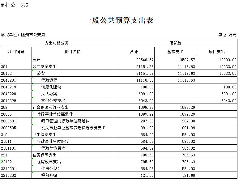 五、一般公共预算支出表