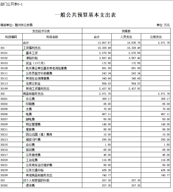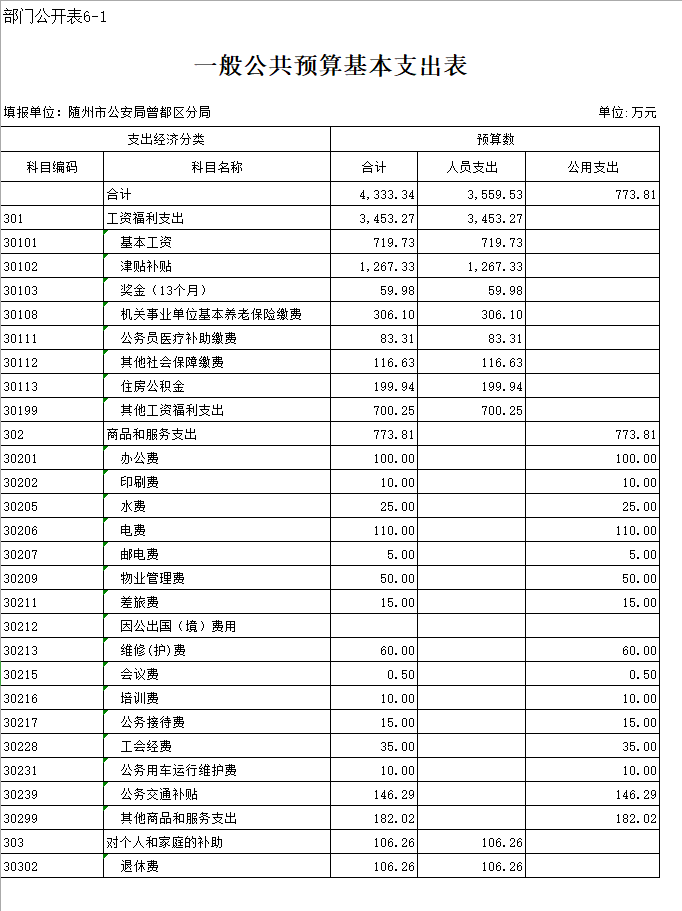 (一)基本支出4478.02万元,比上年度减少498.11万元,减少10.01%。包括人员支出3704.21万元,比上年减少315.86万元,减少7.86%,主要原因是上年预算划拨曾都分局经费按照人员比例计算,不够准确,本年按照预算工资表计算;公用支出773.81万元,减少182.25万元,减少19.06%,主要原因是上年部分业务支出列入公用支出,本年有所调整。