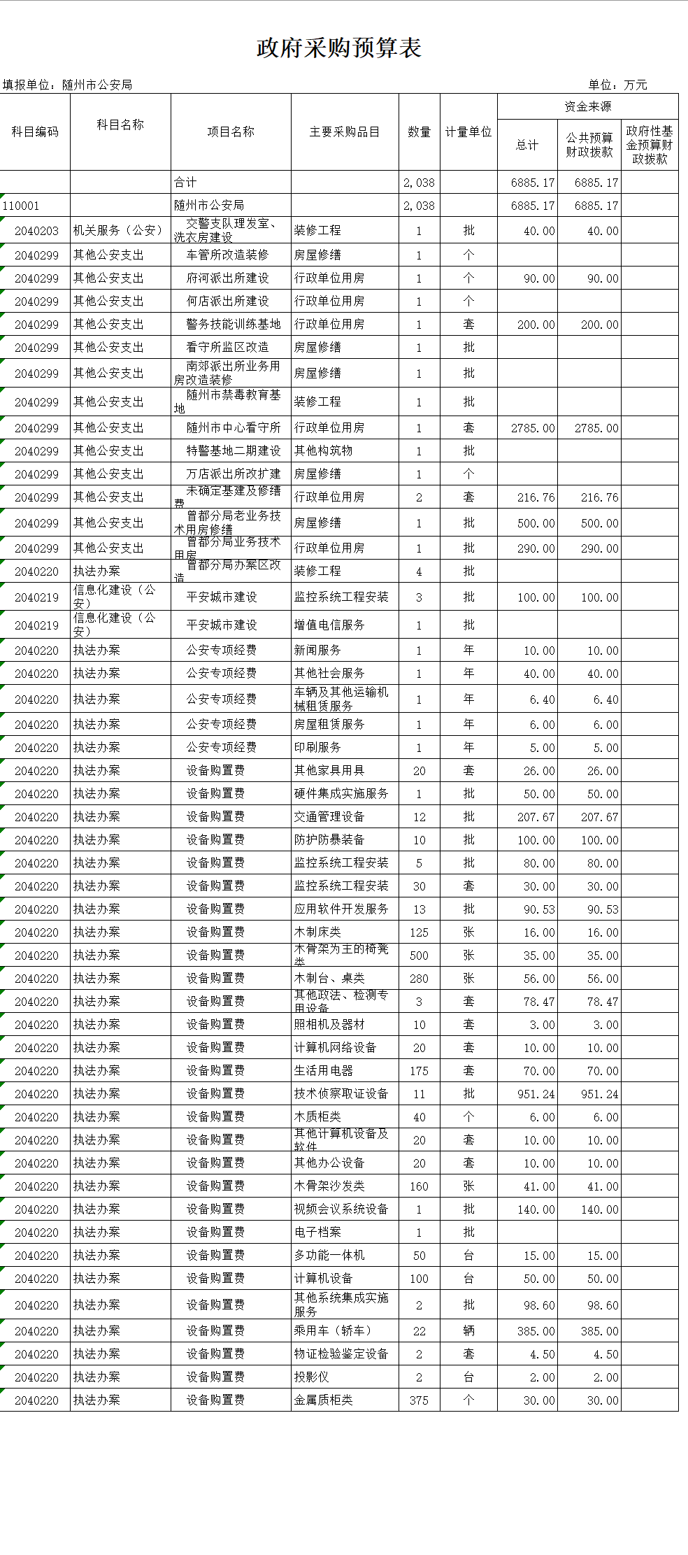 市局法制支队1辆18万元,国保支队1辆18万元,监管支队1辆16万元,交警支队3辆42万元,特警支队4辆48万元,网安支队1辆25万元,曾都分局10辆200万元,治安支队1辆18万元。