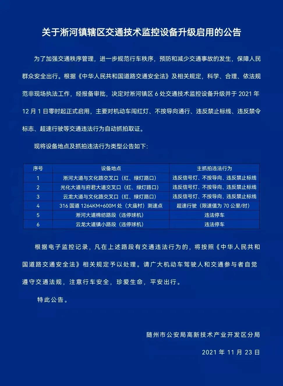 关于淅河镇辖区交通技术监控设备升级启用的公告