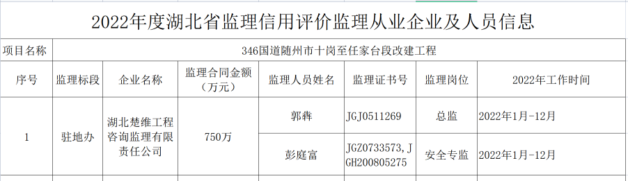 根据《厅质监局关于开展全省2022年度公路水运工程监理信用评价工作的通知》(鄂交质监[2023]12号)要求,按照交通运输部“应评尽评、防止漏评”的要求,经全面梳理2022年度辖区内各类公路建设项目,现将365bet官网注册_bat365app官网入口登录_365bet平台棋牌此次参与公路工程监理信用评价的从业企业和人员信息进行公示(见附表)。