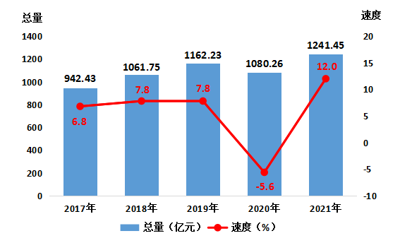 全市实现生产总值(GDP)1241.45亿元,按可比价格计算,比上年增长12.0%。其中,第一产业实现增加值186.23亿元,增长11.1%;第二产业实现增加值525.14亿元,增长14%;第三产业实现增加值530.09亿元,增长10.4%。三次产业比重由2020年的16.0:40.8:43.2调整为15.0:42.3:42.7。按2021年底常住人口计算,全市人均GDP为61102元,按年平均汇率计算折合9471美元。