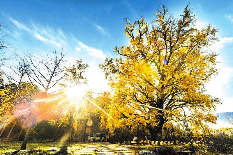 每当到了秋天,树叶像黄金般挂在枝头鲜艳夺目,为了给这株千年古银杏壮威增色,景区在千年银杏古树周围栽了百余株银杏树,这里变成了一片金色的世界。在中国人的审美情趣里,黄色具有光明、华美、富丽的意义,它是辉煌的象征,是美好事物的体现。