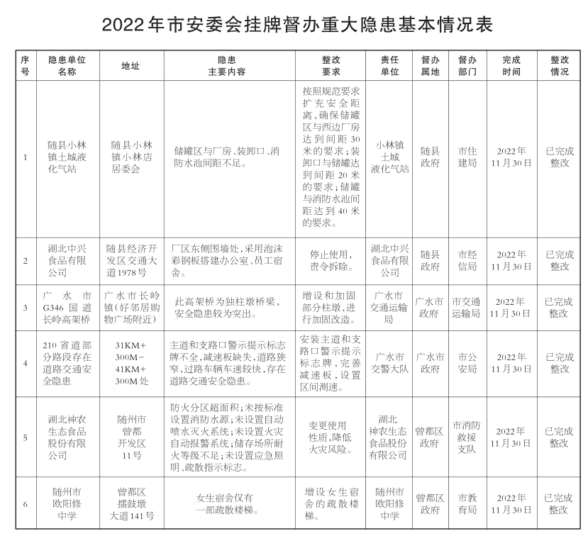 按照《市安委会关于2022年挂牌督办重大安全隐患的通知》(随安〔2022〕7号)要求,各县、市、区政府,市教育局、市经信局、市公安局、市住建局、市交通运输局、市消防救援支队及各整改责任单位(企业)认真落实安全生产责任,严格按照整改措施完成整改工作,及时消除了一批重大安全隐患。 经市安委会办公室组织现场核查验收,并报请市政府同意,现对以下重大隐患予以销号。